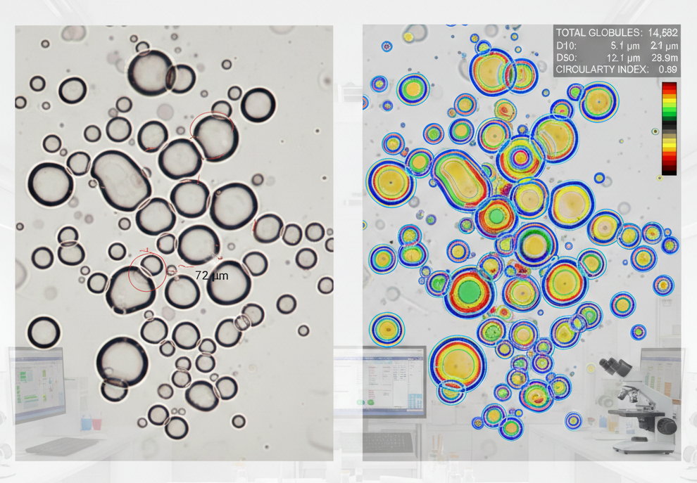 In a cream or emulsion, globules often overlap or “cluster” together. Standard software often miscounts these clusters as one giant globule.
